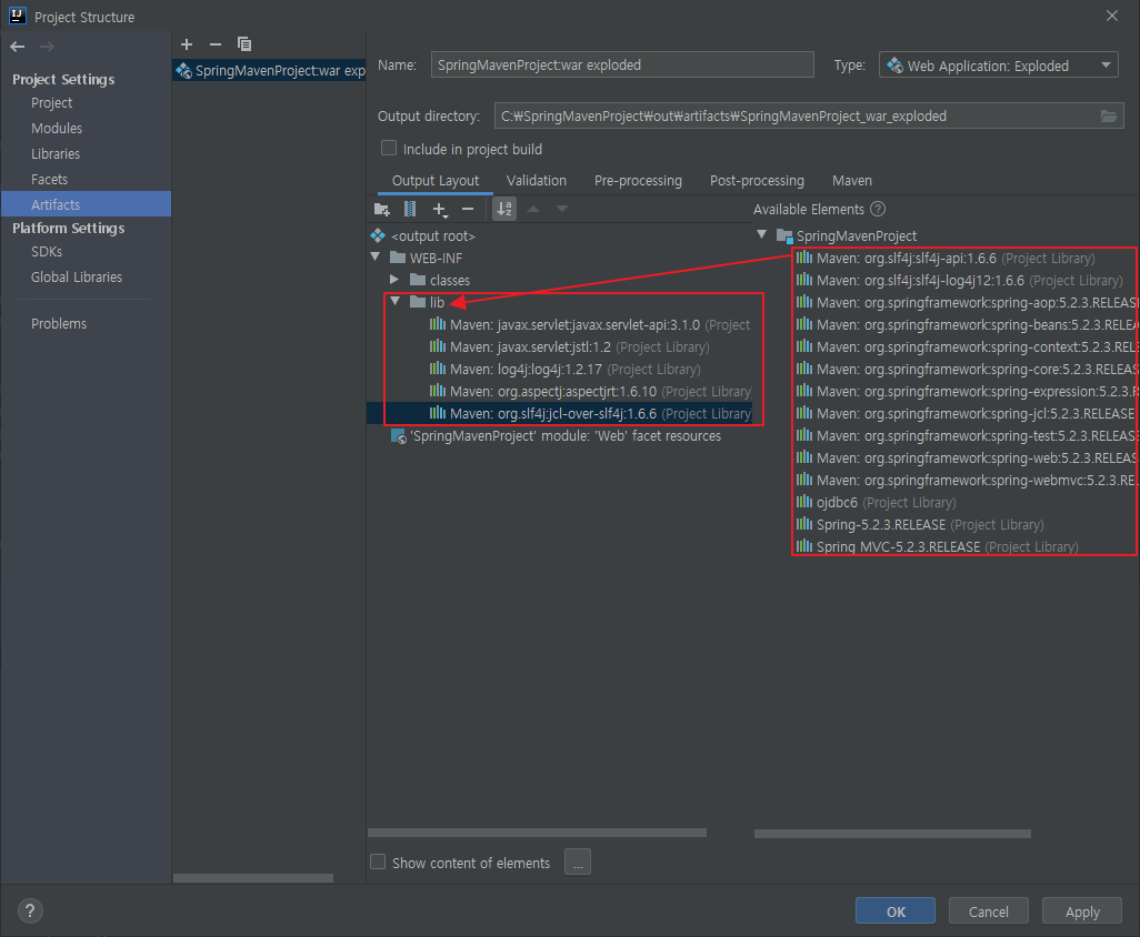 Artifacts를 클릭한 후 pom.xml에 추가하여 생성된 라이브러리들을 더블클릭하여 lib폴더에 옮겨줍니다.