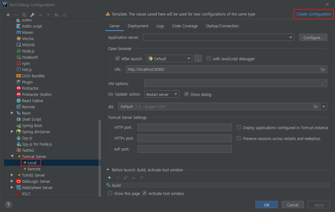 Tocat Server > Local 선택 후 Create configuration을 눌러주세요.